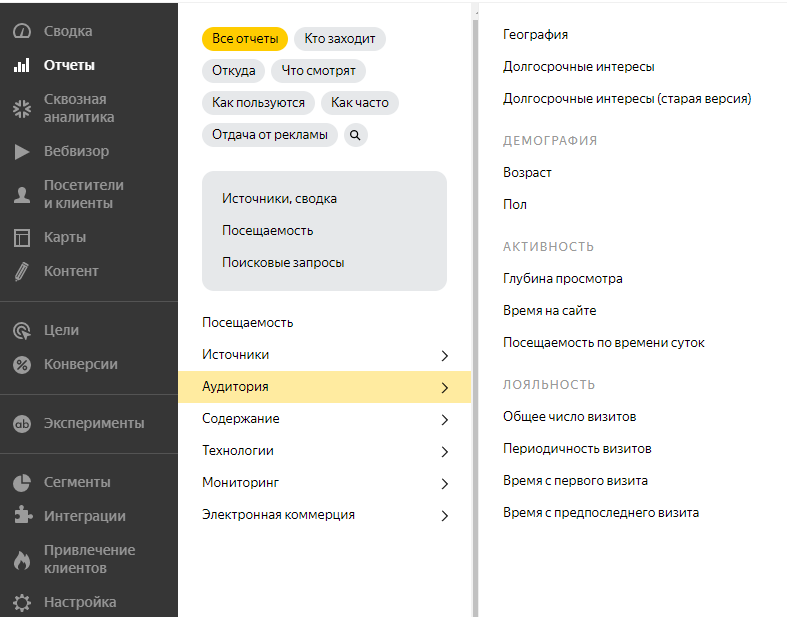 Когда вы войдете в «Метрику», вы увидите панель с левой стороны с различными отчетами и функциями.