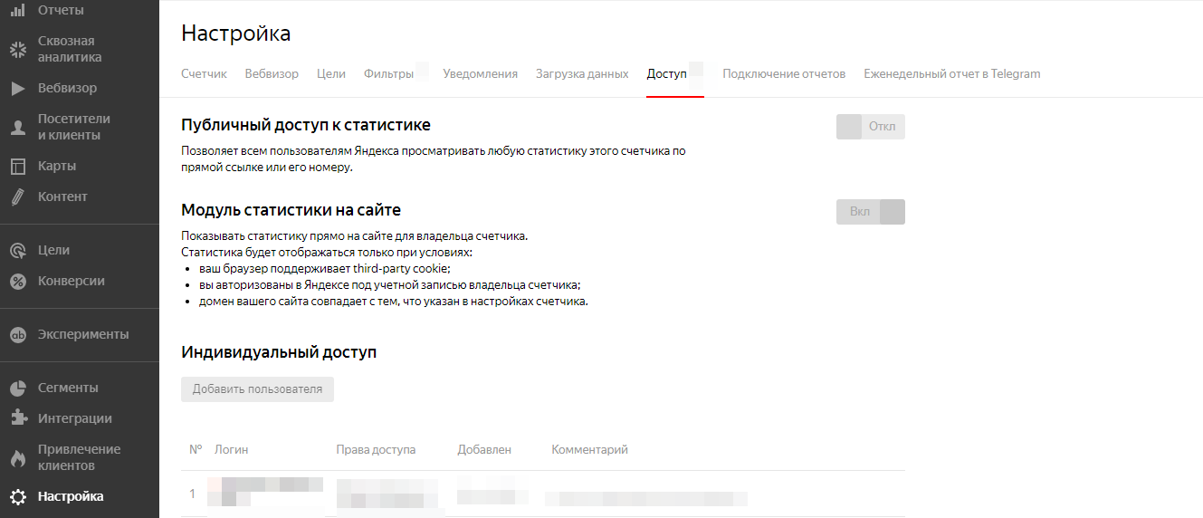 Укажите логин почты и права доступа: просмотр или редактирование. В будущем пользователь может быть удален и потерять доступ к вашей "Метрике".