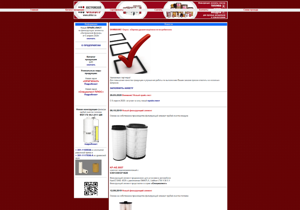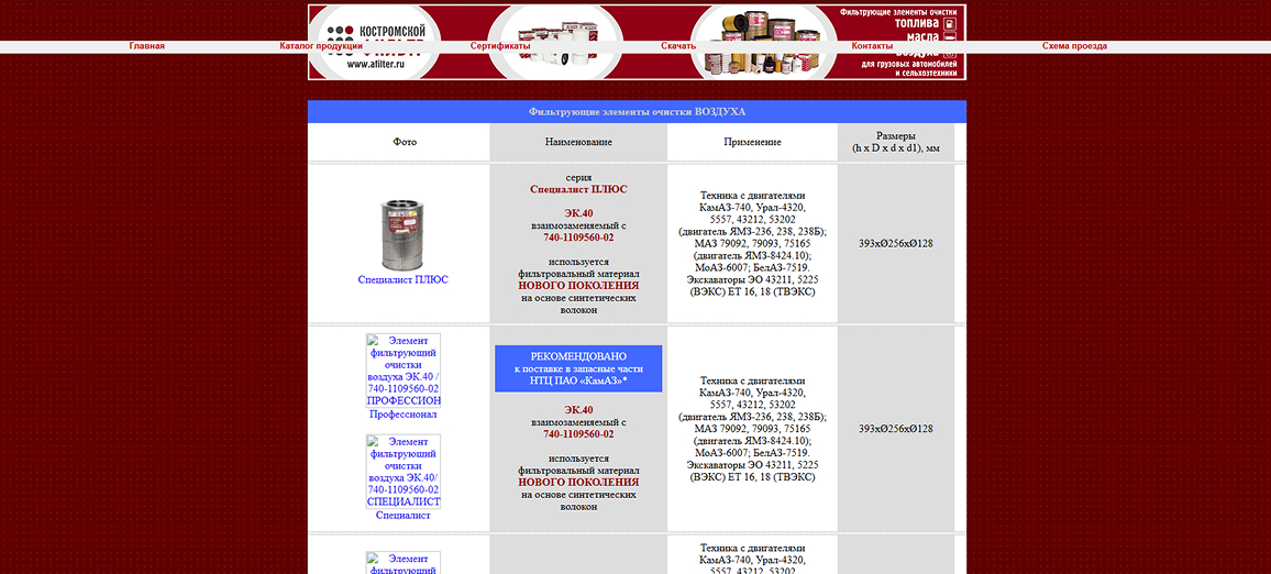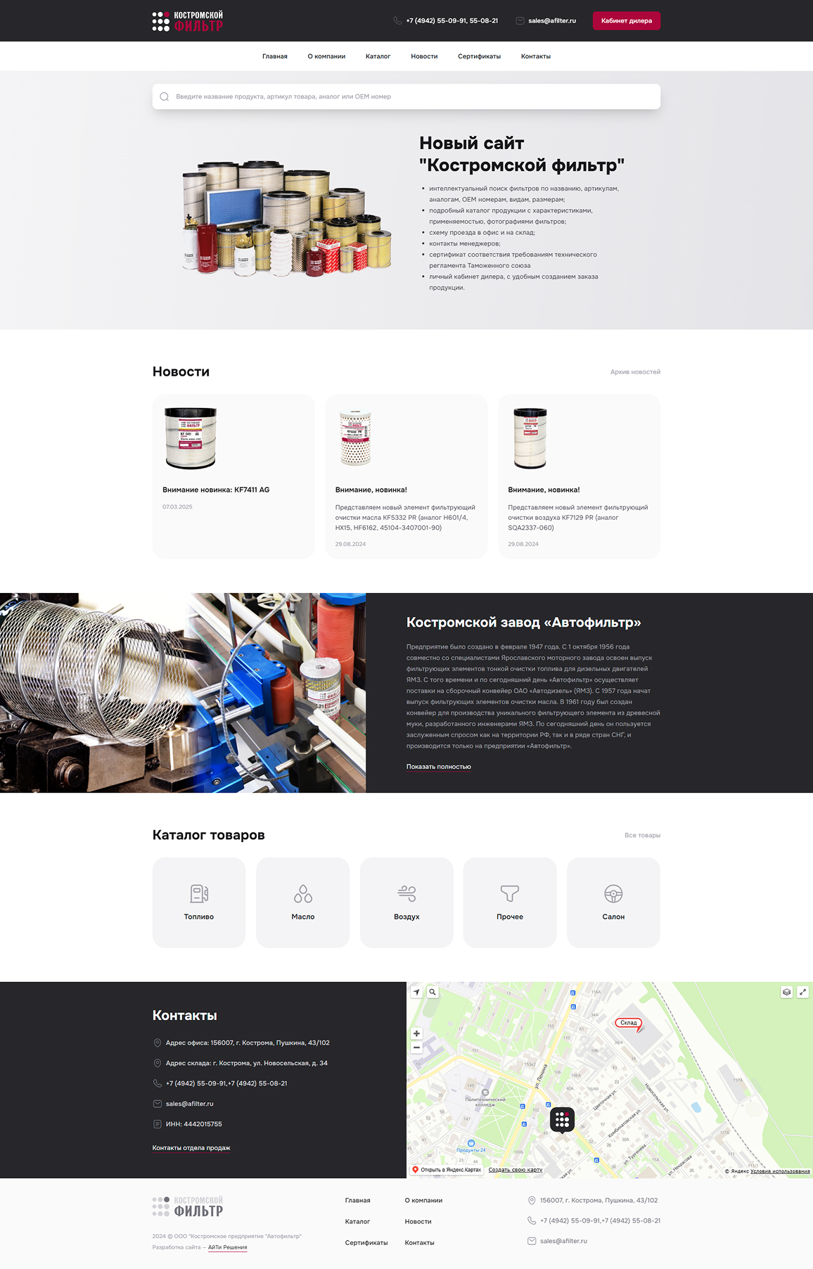Это была интересная и амбициозная цель. Компания «Автофильтр» занимает одно из ведущих мест в производстве автомобильных фильтров в России и СНГ. Более шести десятилетий предприятие удерживает позиции, внедряет новые технологии и расширяет ассортимент. Важно было показать не только богатую историю — например, запуск уникальных фильтров из древесной муки ещё в 1961 году, — но и подчеркнуть, что завод идёт в ногу со временем: современное оборудование, новые материалы, широкий выбор продукции. Мы понимали, что сайт должен одновременно транслировать надёжность и инновационность.