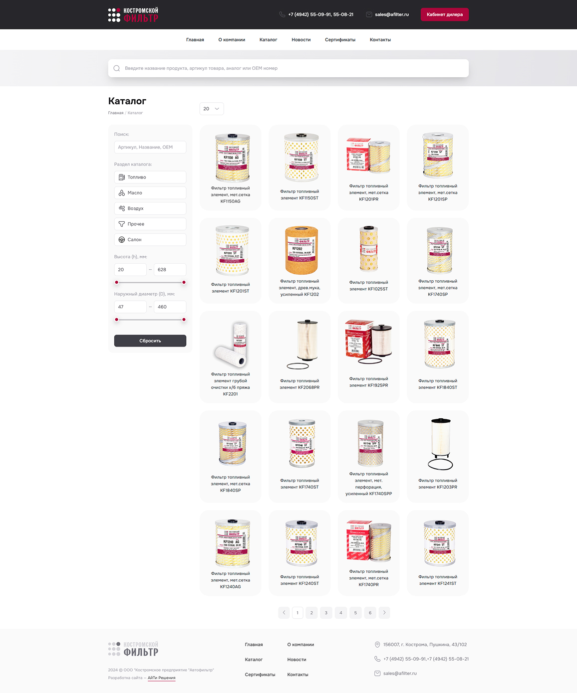 Когда представители завода «Костромской фильтр» обратились к нам, стало понятно: речь идёт о крупном и серьёзном проекте. Перед нами стояла задача не просто обновить дизайн или «освежить» сайт, а полностью переосмыслить цифровое представительство компании. Новый ресурс должен был объединять сразу несколько функций: быть презентацией бренда, рабочим инструментом для партнёров, каналом продаж и площадкой для актуальной информации.