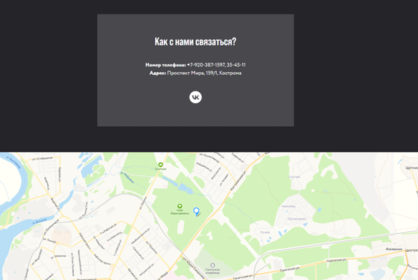 Далее разместили стандартный блок с отзывами, контактами и картой, где отмечен основной офис компании.