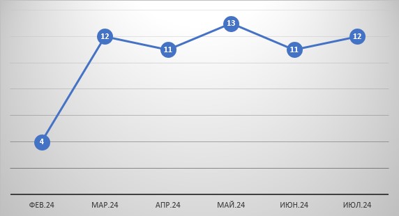 На графике за период с февраля по июль 2024 видно два момента из кампаний: запуск рекламной кампании в марте – резкий скачок трафика и конверсий на сайт. И расширение узких ключей более широкими, что логично привело к повышению трафика и как следствие охвата, но также к небольшому снижению конверсий, что будет нивелироваться дальнейшим масштабированием и оптимизацией кампаний.