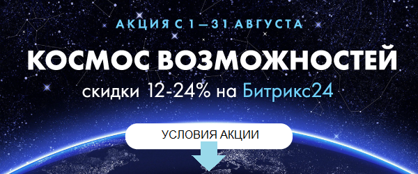 Работать с Битрикс24 - выгодно как никогда. Акция "Космос возможностей" от Битрикс24 проходит до 31 августа 2017 года. На весь комплекс инструментов для совместной работы и управления продажами действуют скидки от 12 до 24%.