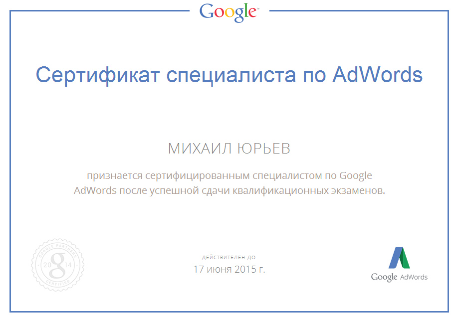 Специалисты нашей компании признаны сертифицированными специалистами по Google AdWords после успешной сдачи квалификационных экзаменов.
