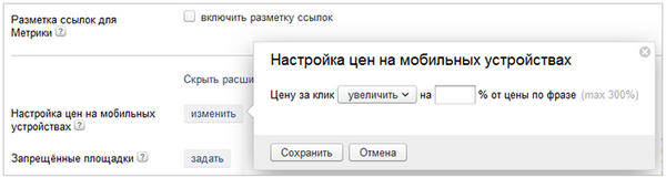 Минимальная цена для показов на мобильных телефонах - половина ставки на стационарных компьютерах, а максимальная - плюс 300% к этой ставке.