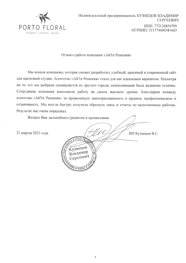 Мы искали компанию, которая сможет разработать удобный, красивый и современный сайт для цветочной студии. Агентство «АйТи Решения» стало для нас идеальным вариантом. Несмотря на то, что мы выбрали специалистов из другого города, коммуникация налажена отлично. Сотрудники выполнили работу на самом высоком уровне. Благодарим команду агентства «АйТи Решения» за проявленную заинтересованность в проекте, профессионализм и отзывчивость. Мы всегда быстро получали обратную связь и отчеты по выполненным задачам. Результат нас очень порадовал.