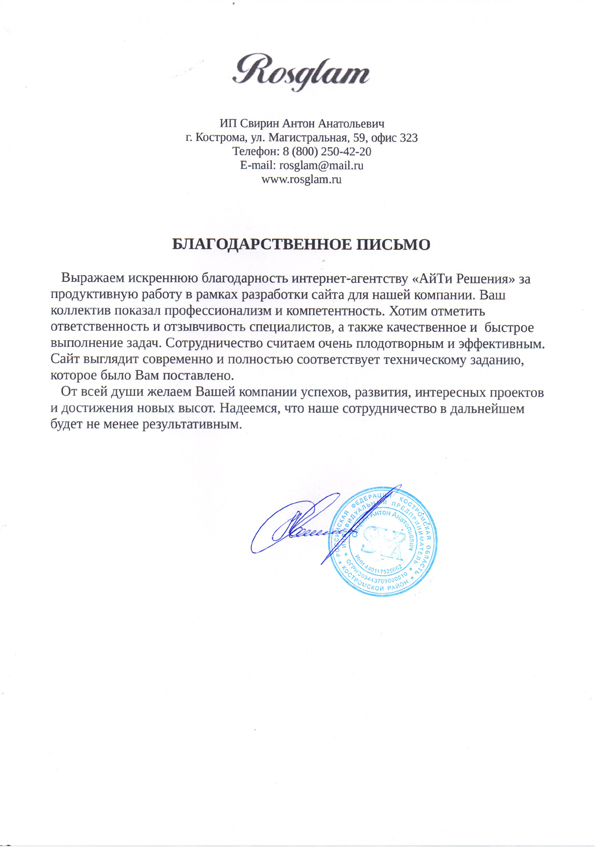 Выражаем искреннюю благодарность агентству «АйТи Решения» за продуктивную работу в рамках создания сайта для нашей компании. Ваш коллектив показал профессионализм и компетентность. Хотим отметить ответственность и отзывчивость специалистов, а также качественное и быстрое выполнение задач. Сотрудничество считаем очень плодотворным и эффективным. Сайт выглядит современно и полностью соответствует техническому заданию, которое было Вам поставлено.