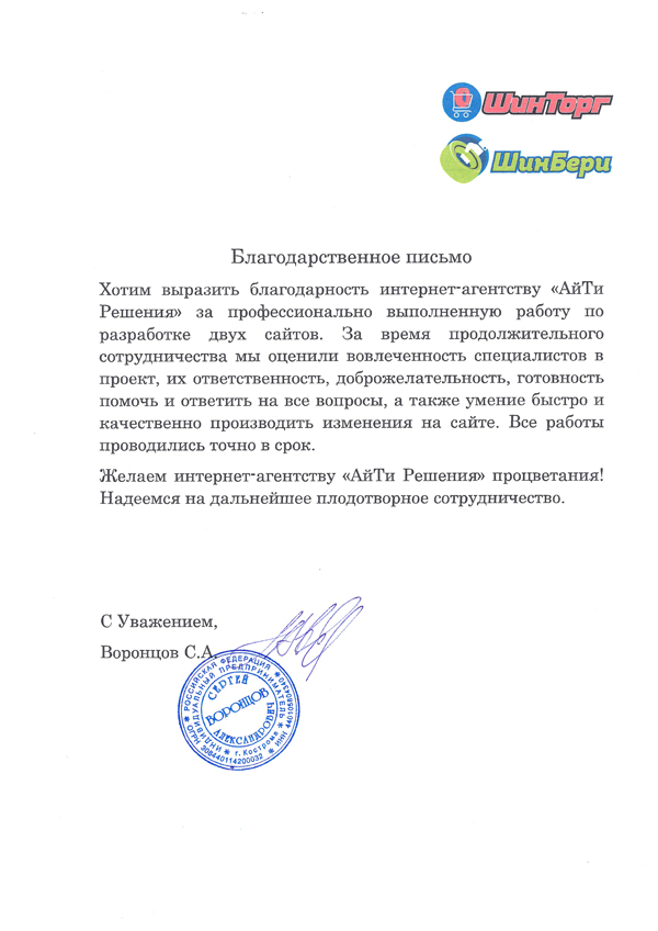 Выражаем искреннюю благодарность агентству «АйТи Решения» за разработку сайта. Ваш коллектив полностью оправдал наше доверие. Задача выполнена профессионально, быстро и качественно. Мы особенно оценили ответственность и интерес, с которыми специалисты подошли к задаче. У нас была возможность отследить каждый этап создания нашего сайта, посоветоваться с менеджером и внести необходимые дополнения. Нас по-настоящему покорили квалифицированность, внимательность, отзывчивость и готовность помочь каждого человека, который работал над проектом. Коллективом компании «АйТи Решения» полностью довольны.