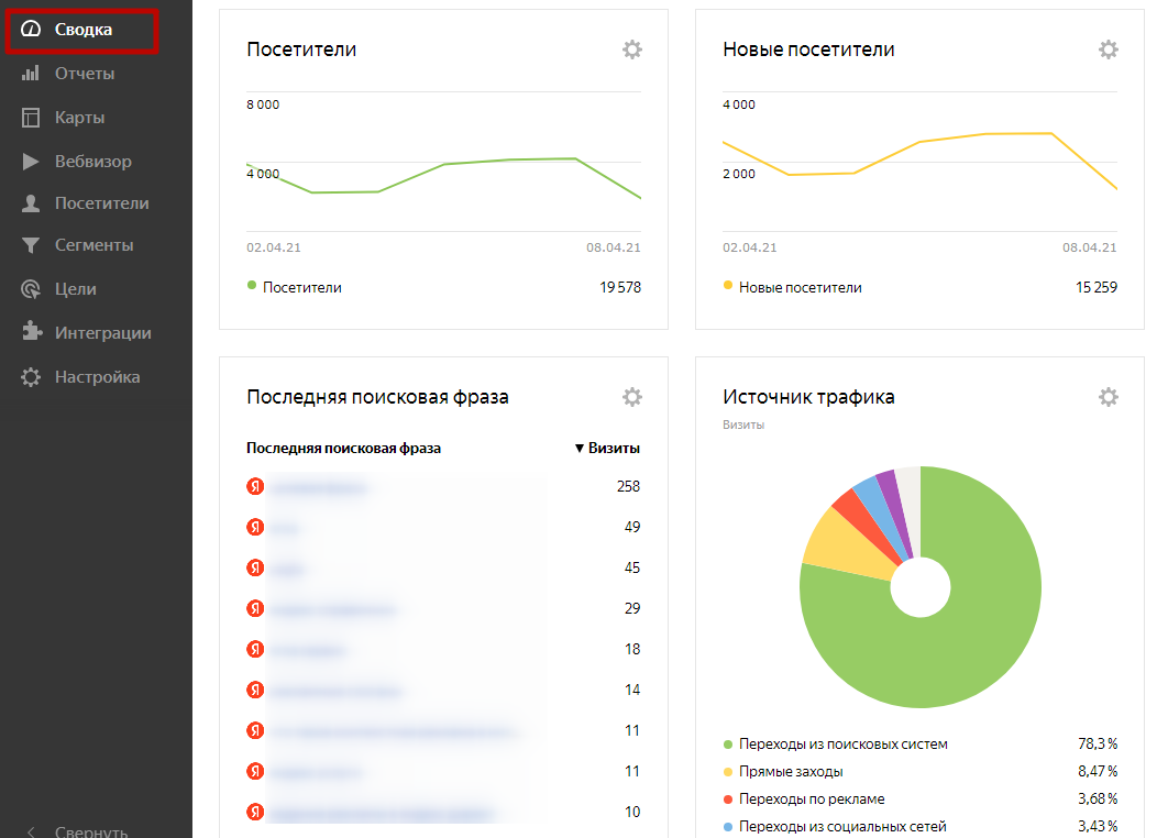 "Сводка" содержит наиболее важные показатели: количество визитов и посетителей, поведенческие факторы и характеристики пользователей. Вам нужна сводка, чтобы быстро проверить, все ли в порядке с вашим сайтом - нет ли резкого падения трафика или конверсии.