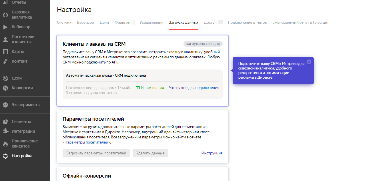 Инструмент загрузки данных позволяет подключать к Метрике другие сервисы. Они необходимы для сбора более подробной статистики и, следовательно, для более глубокого анализа данных.