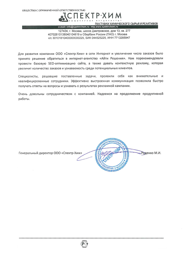 Для развития ООО "Спектр-Хим" в сети Интернет и увеличения числа заказов было принято решение обратиться в агентство «АйТи Решения». Нам порекомендовали провести базовую SЕО-оптимизацию сайта, а также давать контекстную рекламу, которая увеличит количество заказов и узнаваемость среди потенциальных клиентов. Специалисты, решавшие поставленные задачи, проявили себя как внимательные и квалифицированные сотрудники. Эффективно выстроенная коммуникация позволила быстро получать ответы на вопросы и узнавать о результатах рекламной кампании. Очень довольны сотрудничеством. Надеемся на продолжение продуктивного сотрудничества.
