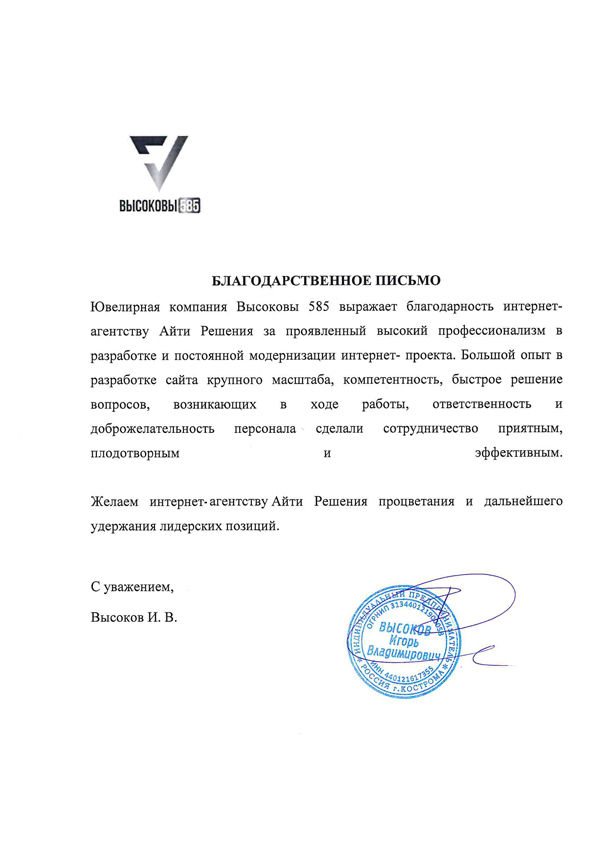 Выражаем искреннюю благодарность агентству «АйТи Решения» за продуктивную работу в рамках создания сайта для нашей компании. Ваш коллектив показал профессионализм и компетентность. Хотим отметить ответственность и отзывчивость специалистов, а также качественное и быстрое выполнение задач. Сотрудничество считаем очень плодотворным и эффективным. Сайт выглядит современно и полностью соответствует техническому заданию, которое было Вам поставлено.
